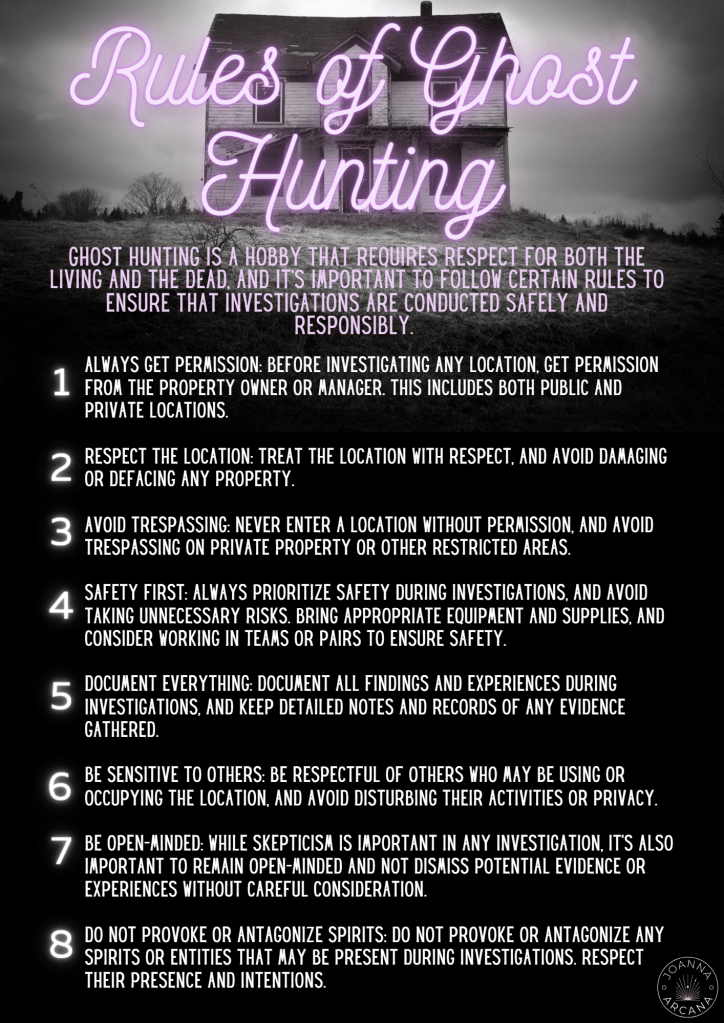 Ghost hunting is a hobby that requires respect for both the living and the dead, and it’s important to follow certain rules to ensure that investigations are conducted safely and responsibly. Here are some general rules of ghost hunting:
